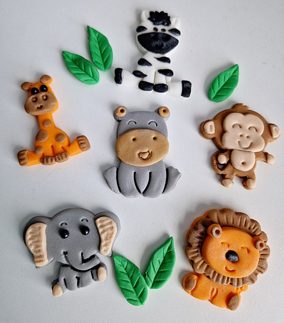 6 Edible zoo animals cake/ cupcake toppers,size is around 2",you'll get 7 leaves as well.