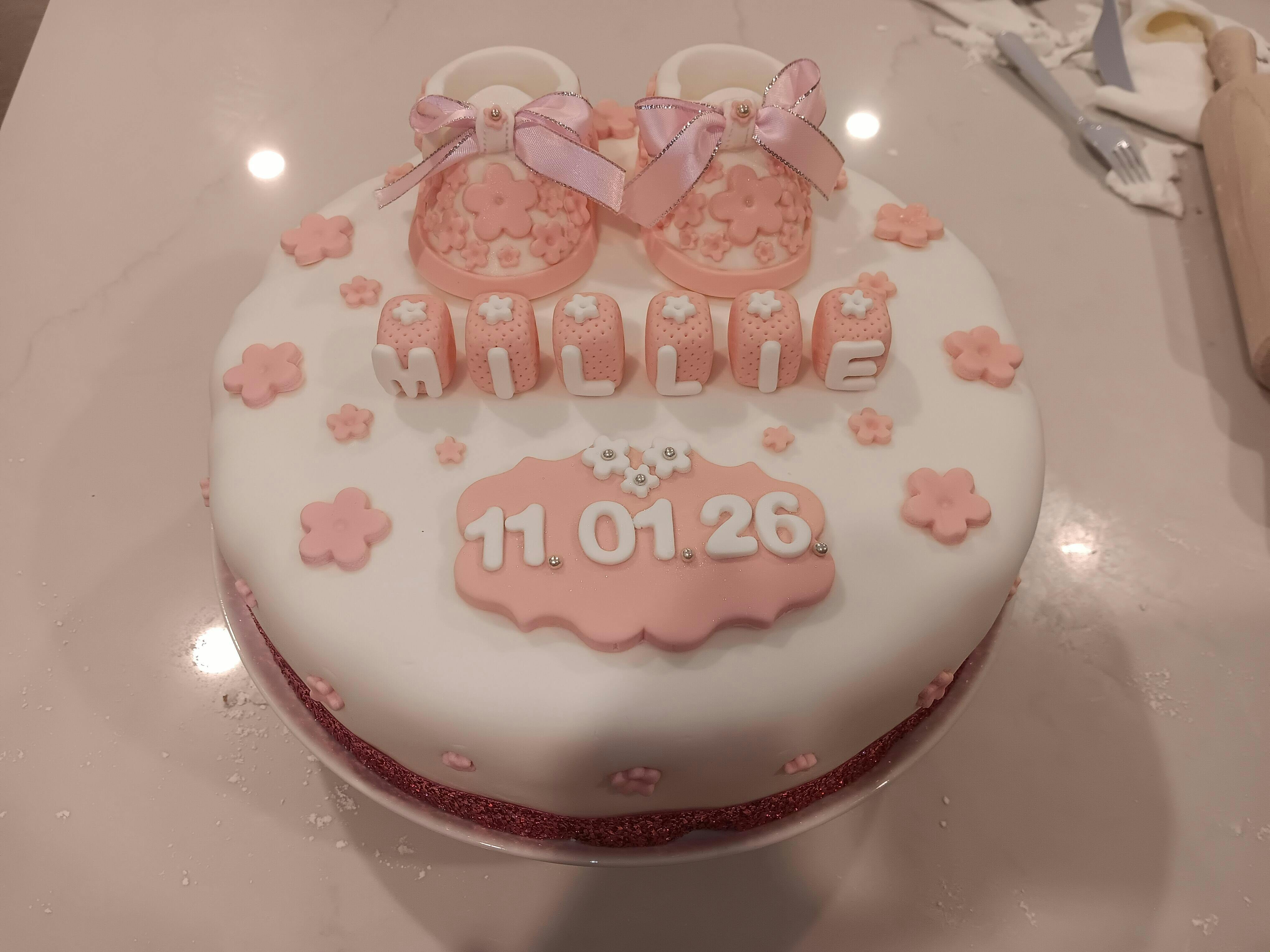 Edible baptism cake decoration,each shoe is around 3.5",you'll get plaque and up to 8 name blocks(any extra is 1€ each and 15 flowers or stars