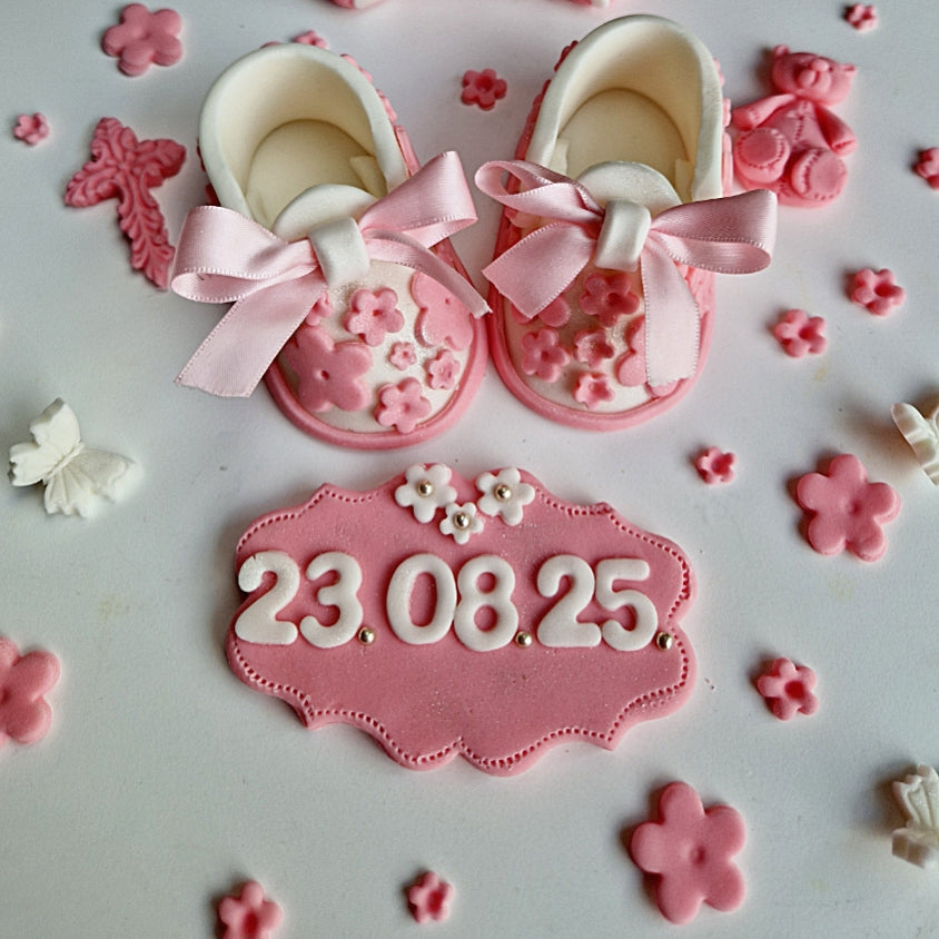 Edible life size baby booties,You also will get 15 flowers or stars,date plaque,name,1 cross,4 butterflies,baby grow and baby bottle.