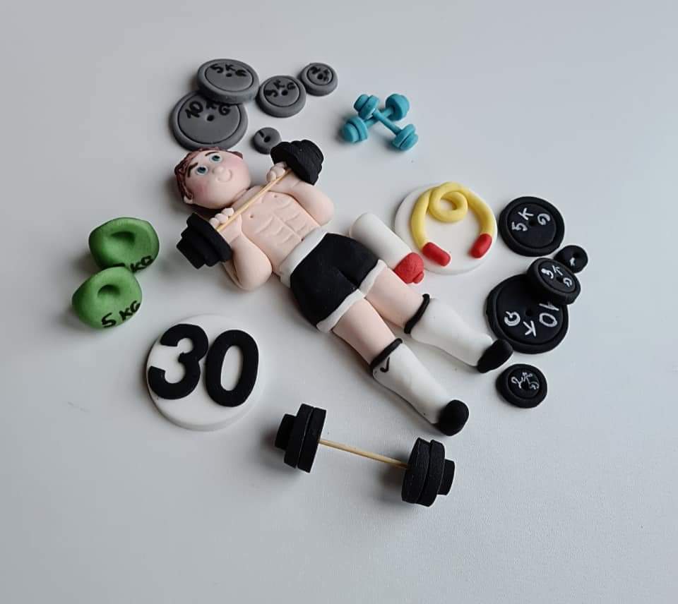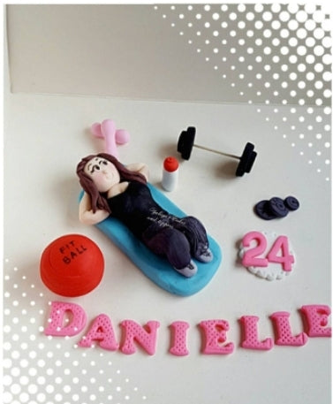 Edible gym themed toppers,man or woman (around 4"),name,age qnd some weights is included.Made to order from proffesional quality sugarpaste,also used edible glue and food colours.Shelf life is up to 3 month.Store in the cool,dark place and out of direct sunlight.The colours can be changed so please let me know which one would you like.Im an experienced cake maker with a passion for perfection.Im working from HSE approved kitchen and qualified in food safety.