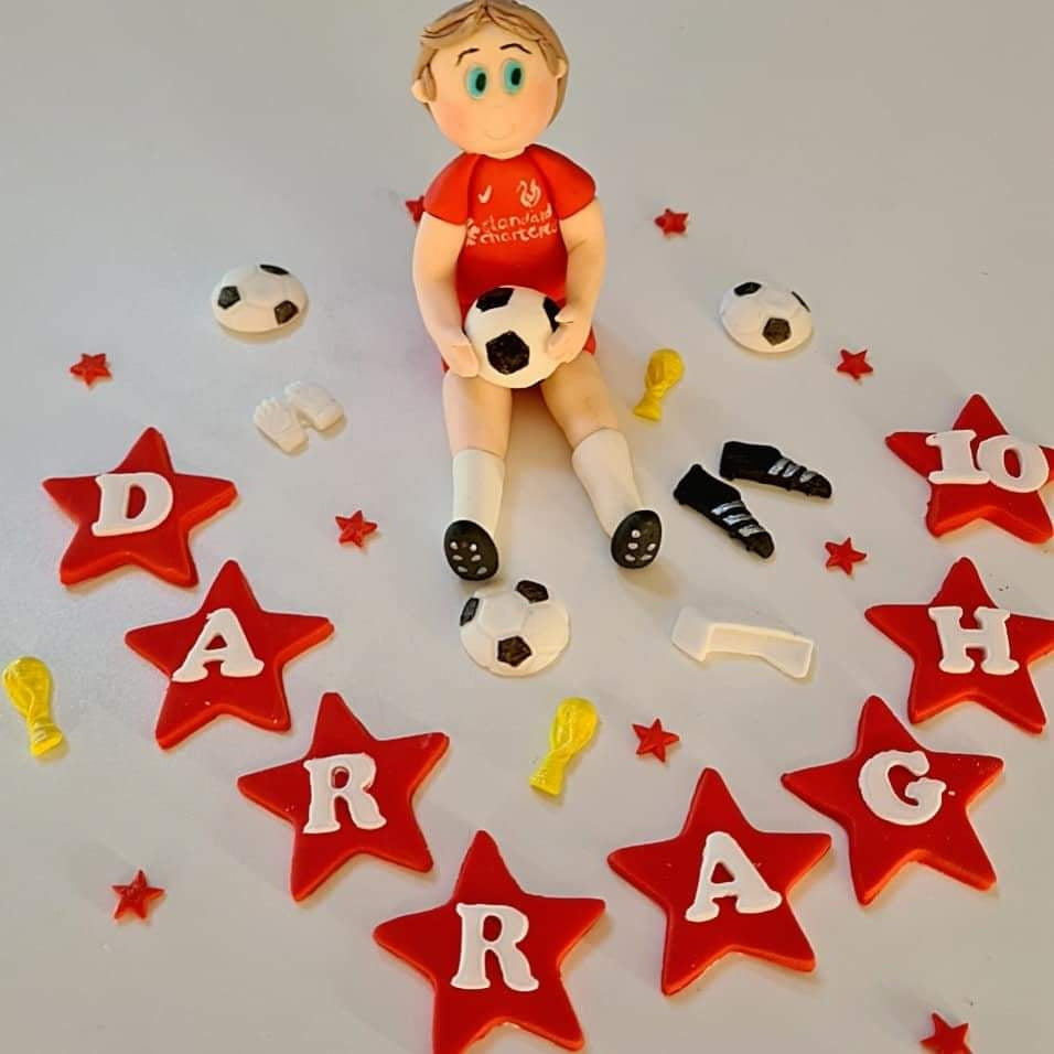 Edible soccer/football player cake topper.You get 1 player figurine (around 3.5"), 3 trophies,3 balls,15 small stars,name stars and the age star.